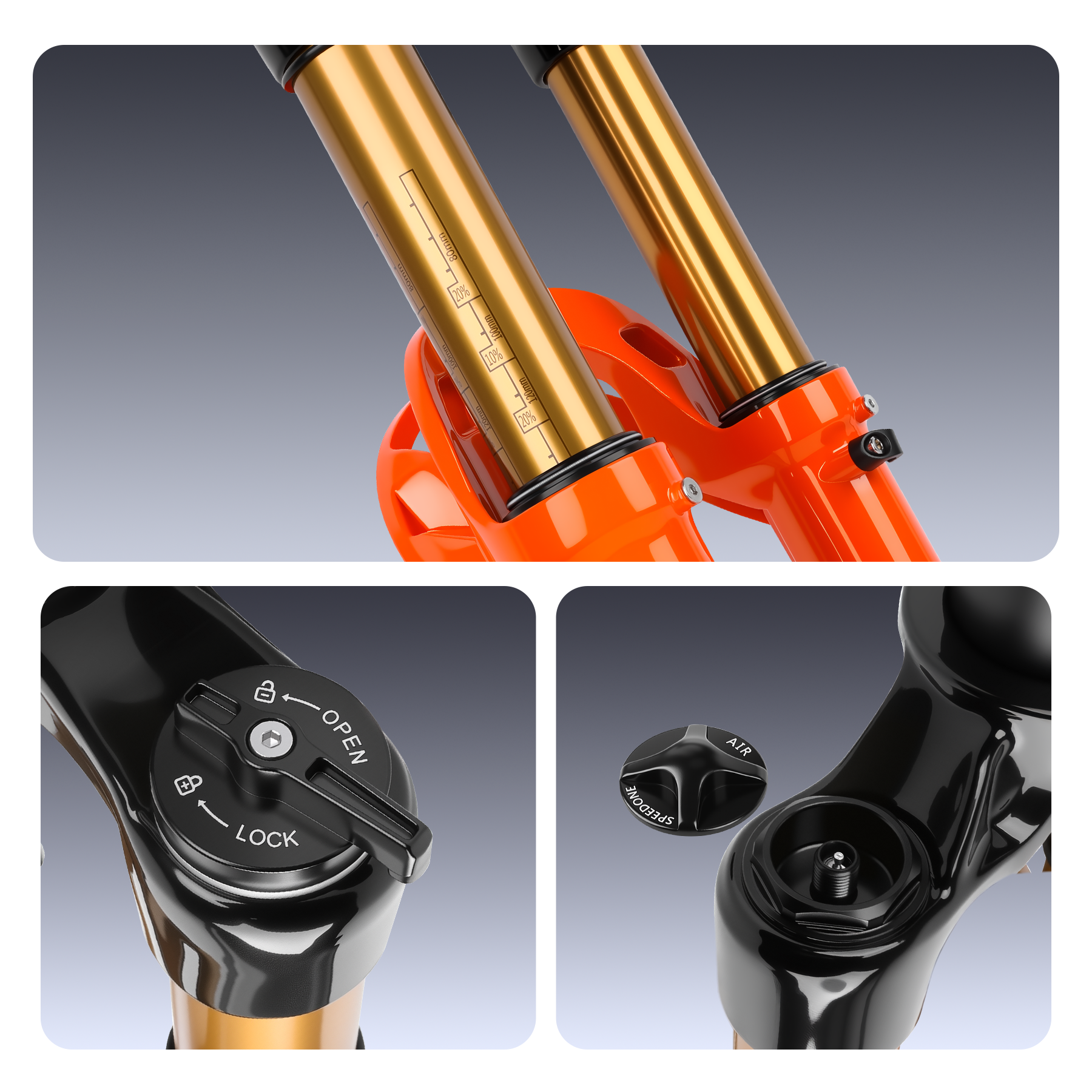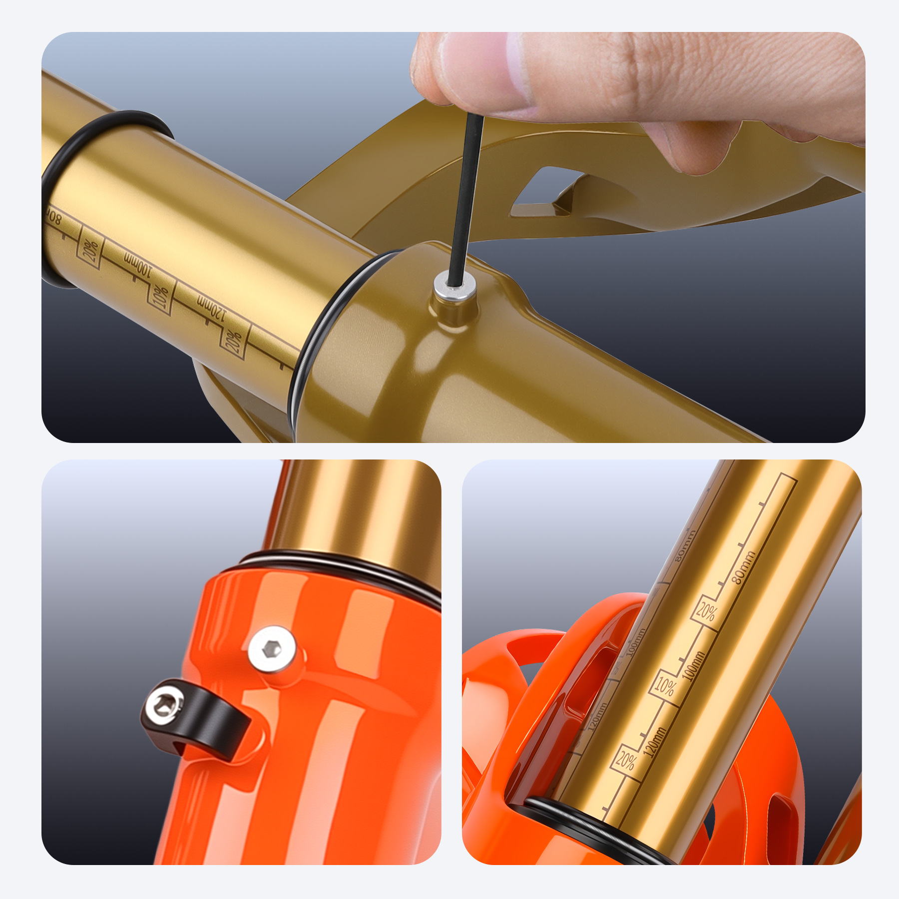 Anodized inner tubes with multi-color appearance—wear-resistant and corrosion-resistant, visually more eye-catching. The golden inner tube is with black/golden fork legs, which is both textured and durable.